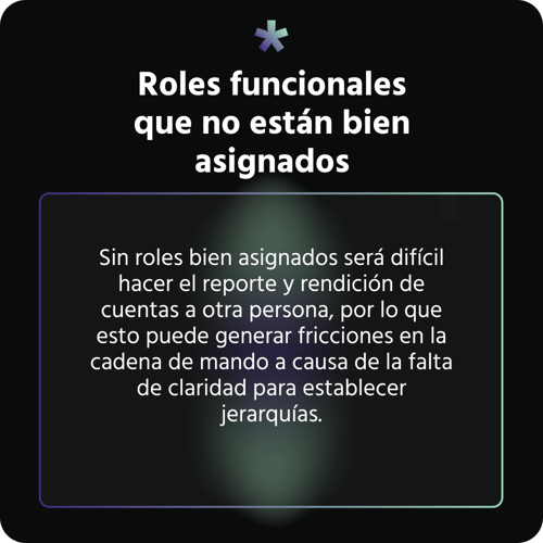 Además, sin roles bien asignados será difícil hacer el reporte y rendición de cuentas a otra persona, por lo que esto puede generar fricciones en la cadena de mando a causa de la falta de claridad para establecer jerarquías y a quién debe responder una persona y otra.