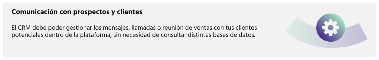 Aquí, el CRM debe poder gestionar de manera eficiente y efectiva los mensajes, llamadas o una reunión de ventas con tus clientes potenciales dentro de la plataforma, sin necesidad de consultar distintas bases de datos fuera la dela plataforma.