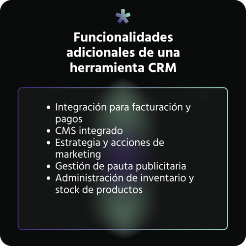 Además de las funciones estándar que incluyen todos o la mayoría de las soluciones CRM, podemos hilar más fino en nuestra búsqueda conociendo de antemano funcionalidades adicionales o más específicas que permitirán sacarle el máximo provecho a la herramienta, haciendo más dinámicas las distintas etapas del proceso comercial generando valor.