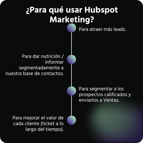 Marketing Hub es un software de automatización todo en uno, que conecta los datos de tus clientes en todo el CRM de HubSpot. Es el módulo de la plataforma pensado para proveer nutrición a los prospectos y leads, para aumentar la probabilidad de convertirlos en clientes, y a su vez, a quienes ya son clientes, continuar incrementando tu ticket a lo largo del tiempo, lo que se conoce como incremento del life time value. (LTV).