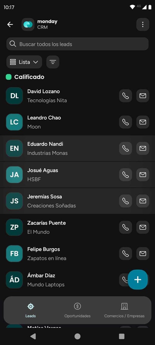 Como si se tratara de tu propia lista de contactos, la app de monday te permite almacenar la información, registrar las llamadas telefónicas emails y reuniones., identificar cuáles de estos contactos está calificado y seleccionarlos para iniciar un proceso comercial.
