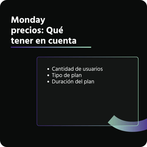Para decidir por el mejor plan que se adapte a tus necesidades, debes considerar 3 factores en primera instancia: cantidad de usuarios que usarán tu cuenta de monday.com, el tipo de plan y la duración de dicho plan.