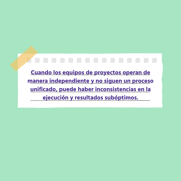 Cuando los equipos de proyectos operan de manera independiente y no siguen un proceso unificado, puede haber inconsistencias en la ejecución y resultados subóptimos.